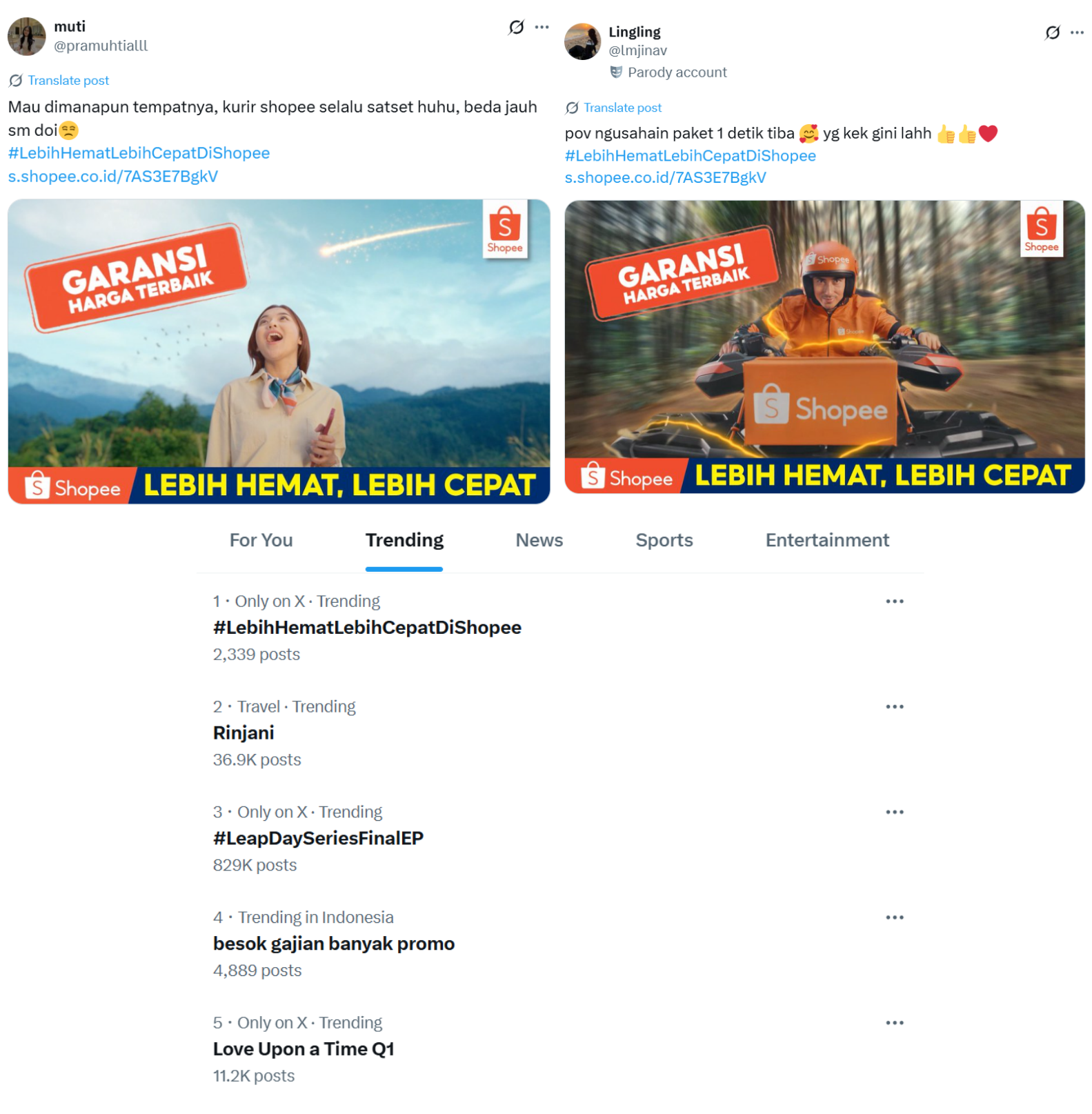 Iklan tersebut juga menjadi perbincangan hangat di media sosial X, dimana banyak warganet yang berlomba membagikan ulang cuplikan iklan favorit mereka. Bahkan hashtag #LebihHematLebihCepatdiShopee juga masuk ke Trending Topic di X pada pagi tadi saat iklan ini diluncurkan.