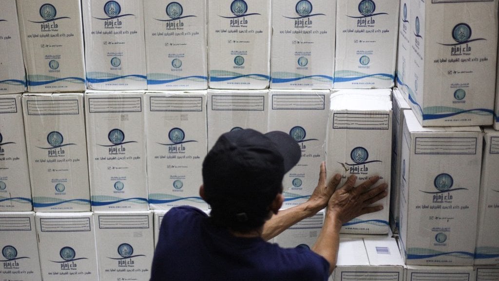 Kupon yang didapat dari penjaga kasir bisa dipakai untuk mengklaim air Zamzam di area “Pick Up” yang umumnya terletak tepat di samping kasir. Berikan kupon tersebut kepada staf dan Anda akan menerima air Zamzam yang dikemas dalam kotak karton.